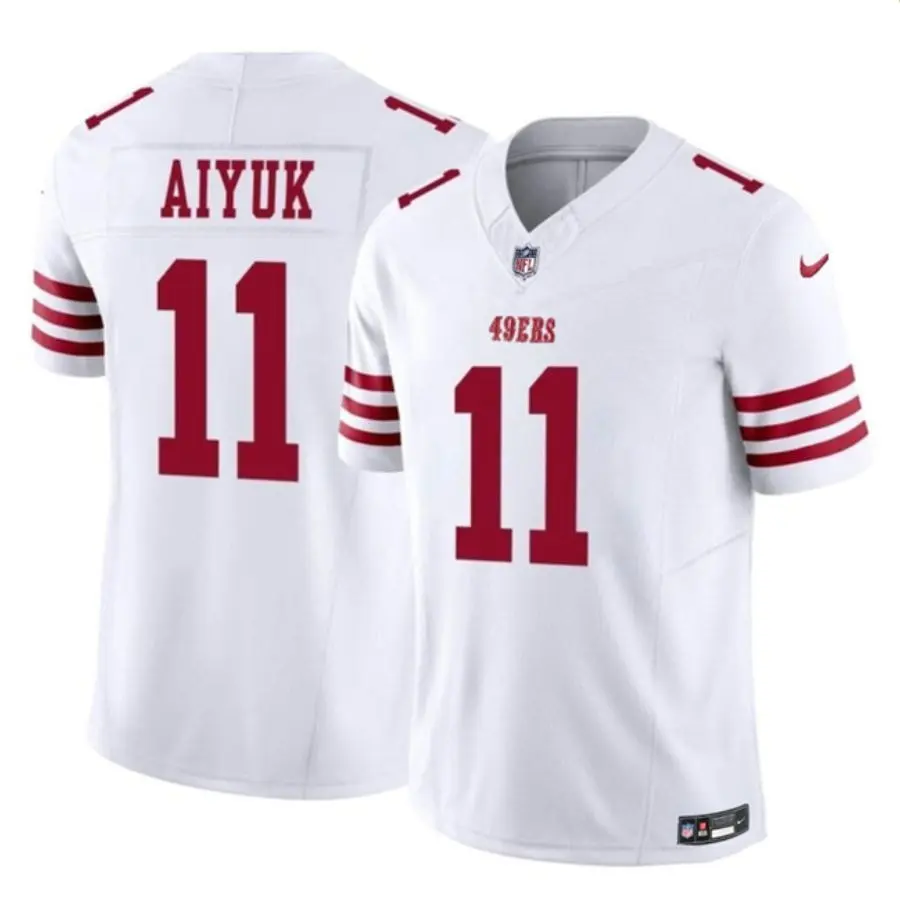 Elevate your game day wardrobe with this premium San Francisco 49ers #11 Brandon Aiyuk jersey. Designed in a crisp white colorway, this piece features high-quality stitched name and numbers for a professional look and long-lasting durability. The breathable, lightweight fabric ensures maximum comfort whether you are cheering from the stands at Levi’s Stadium or hosting a backyard tailgate. Precision embroidery and reinforced seams capture the classic gridiron aesthetic, making it an essential item for any faithful supporter. Celebrate your favorite wide receiver with a garment that combines timeless style with rugged construction for every touchdown moment.