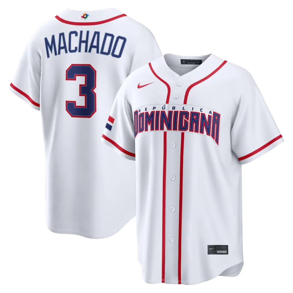 Represent the pride of the Caribbean with this premium Dominican Republic baseball jersey, designed for the 2026 World Baseball Classic. This white home edition features Manny Machado’s name and number expertly stitched for a high-quality, long-lasting finish. Constructed from breathable, moisture-wicking fabric, the jersey ensures maximum comfort whether you are at the stadium or playing on the field. The vibrant national colors and detailed chest lettering capture the spirit of Dominican baseball excellence. With a classic button-down front and an athletic cut, this piece is an essential addition for any fan looking to support their favorite third baseman and national team during the world’s premier international tournament.