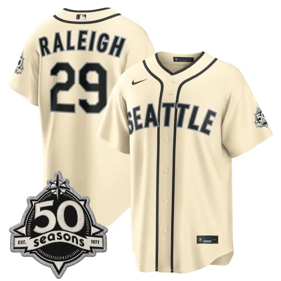 This 2026 cream alternate stitched jersey features Cal Raleigh in a refined design with a soft, vintage-inspired colorway. The cream base is paired with carefully stitched name and numbering, adding texture and long-lasting detail. Designed with a comfortable athletic fit, the jersey is suitable for everyday wear while maintaining a strong game-inspired presence. Clean lines and balanced proportions reflect the alternate styling associated with the Seattle Mariners, giving the piece a composed and timeless appearance.