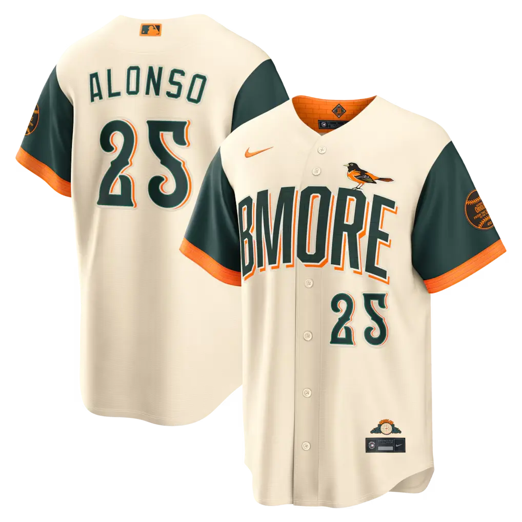 Celebrate Baltimore baseball with this premium Pete Alonso City Connect jersey. Featuring a sophisticated natural cream colorway, this garment captures the essence of the city’s vibrant culture and history. Every detail is meticulously crafted with heavy-duty tackle twill stitching, ensuring the player name and iconic number 20 remain durable through every inning. The breathable, high-performance fabric keeps you cool during summer games at the yard, while the athletic cut provides a sleek, modern fit. With intricate embroidery and unique design elements exclusive to the 2026 collection, this jersey is a must-have for any dedicated fan looking to represent their team in style.